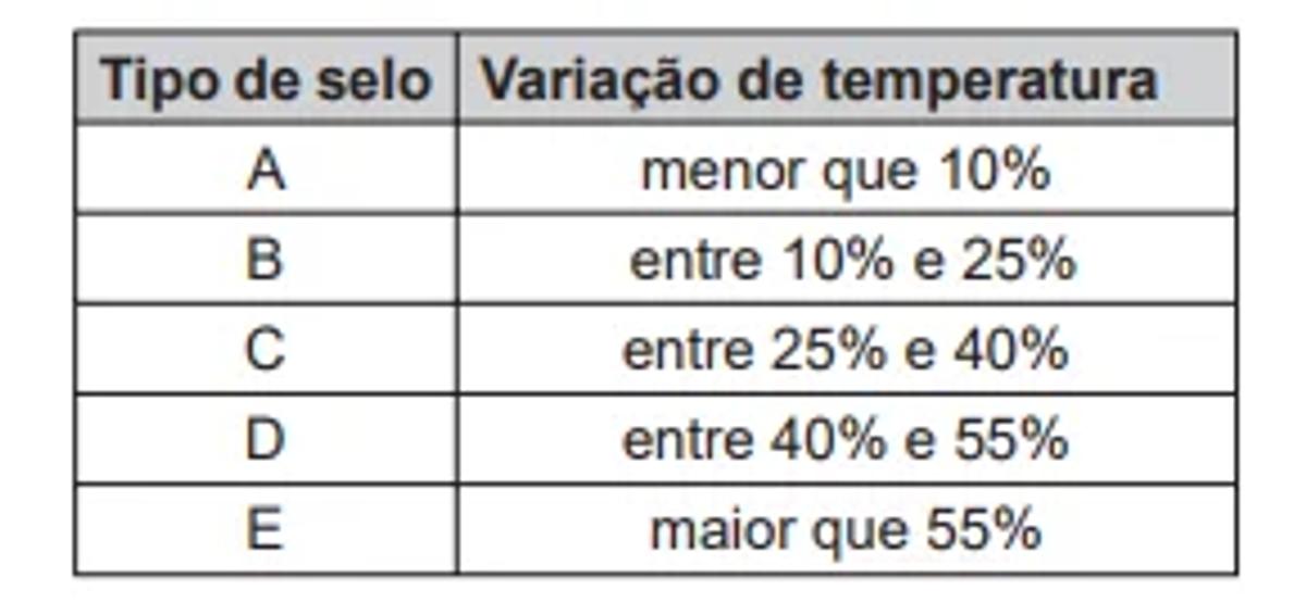 Uma garrafa térmica tem como função evitar a troca de calor entre o líquido nela contido e o ambiente, mantendo a temperatura de seu conteúdo constante. Uma forma de orientar os consumidores na compra de uma garrafa térmica seria criar um selo de qualidade, como se faz atualmente para informar o consumo de energia de eletrodomésticos. O selo identificaria cinco categorias e informaria a variação de temperatura do conteúdo da garrafa, depois de decorridas seis horas de seu fechamento, por meio de uma porcentagem do valor inicial da temperatura de equilíbrio do líquido na garrafa. O quadro apresenta as categorias e os intervalos de variação percentual da temperatura.