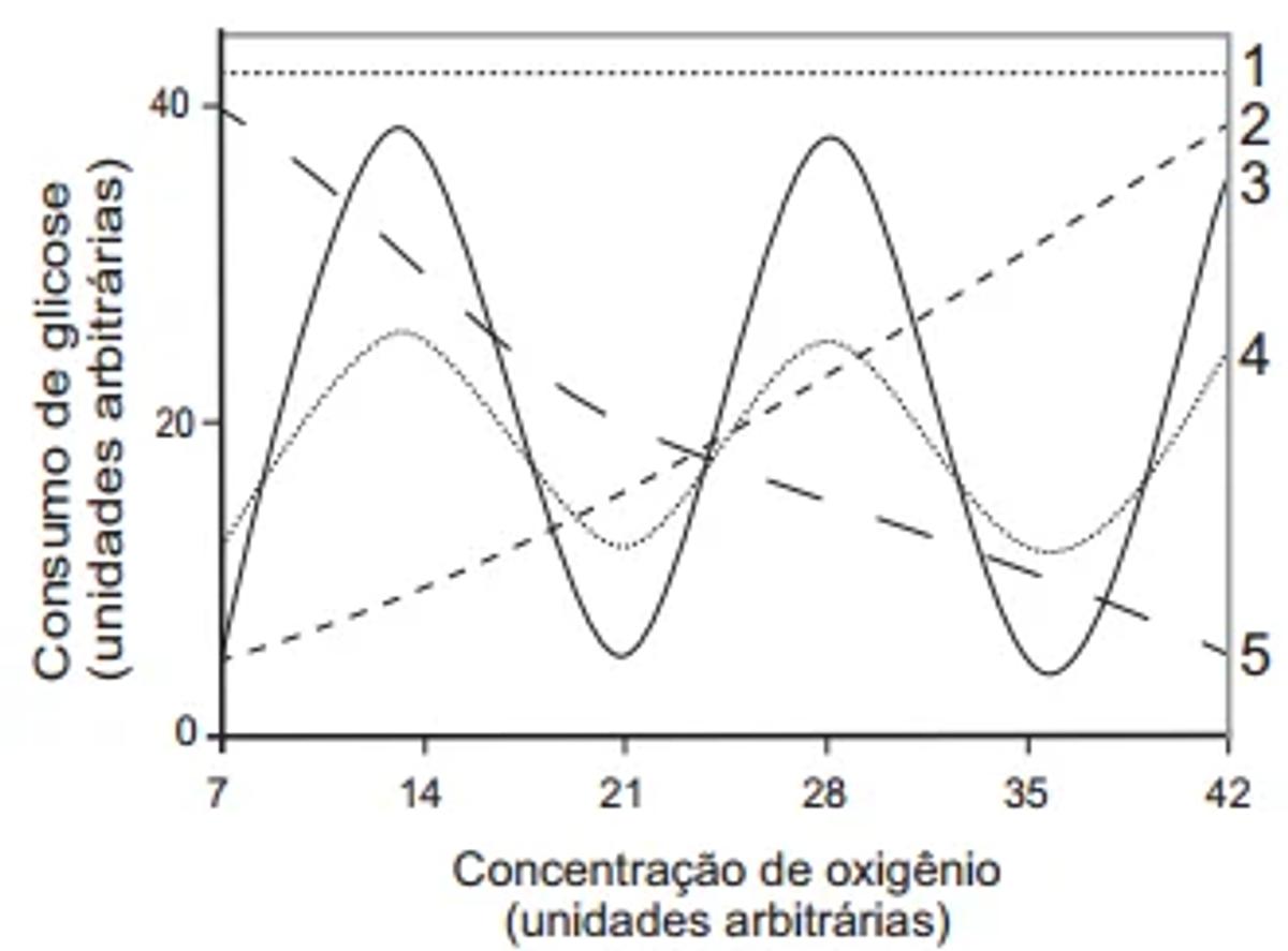 Qual curva representa o perfil de consumo de glicose, para manutenção da homeostase de uma célula que inicialmente está em uma condição anaeróbica e é submetida a um aumento gradual da concentração de oxigênio?