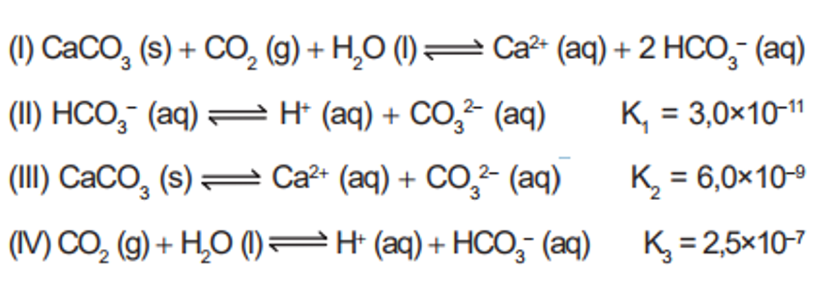 Vários ácidos são utilizados em indústrias que descartam seus efluentes nos corpos d’água, como rios e lagos, podendo afetar o equilíbrio ambiental. Para neutralizar a acidez, o sal carbonato de cálcio pode ser adicionado ao efluente, em quantidades apropriadas, pois produz bicarbonato, que neutraliza a água. As equações envolvidas no processo são apresentadas:
