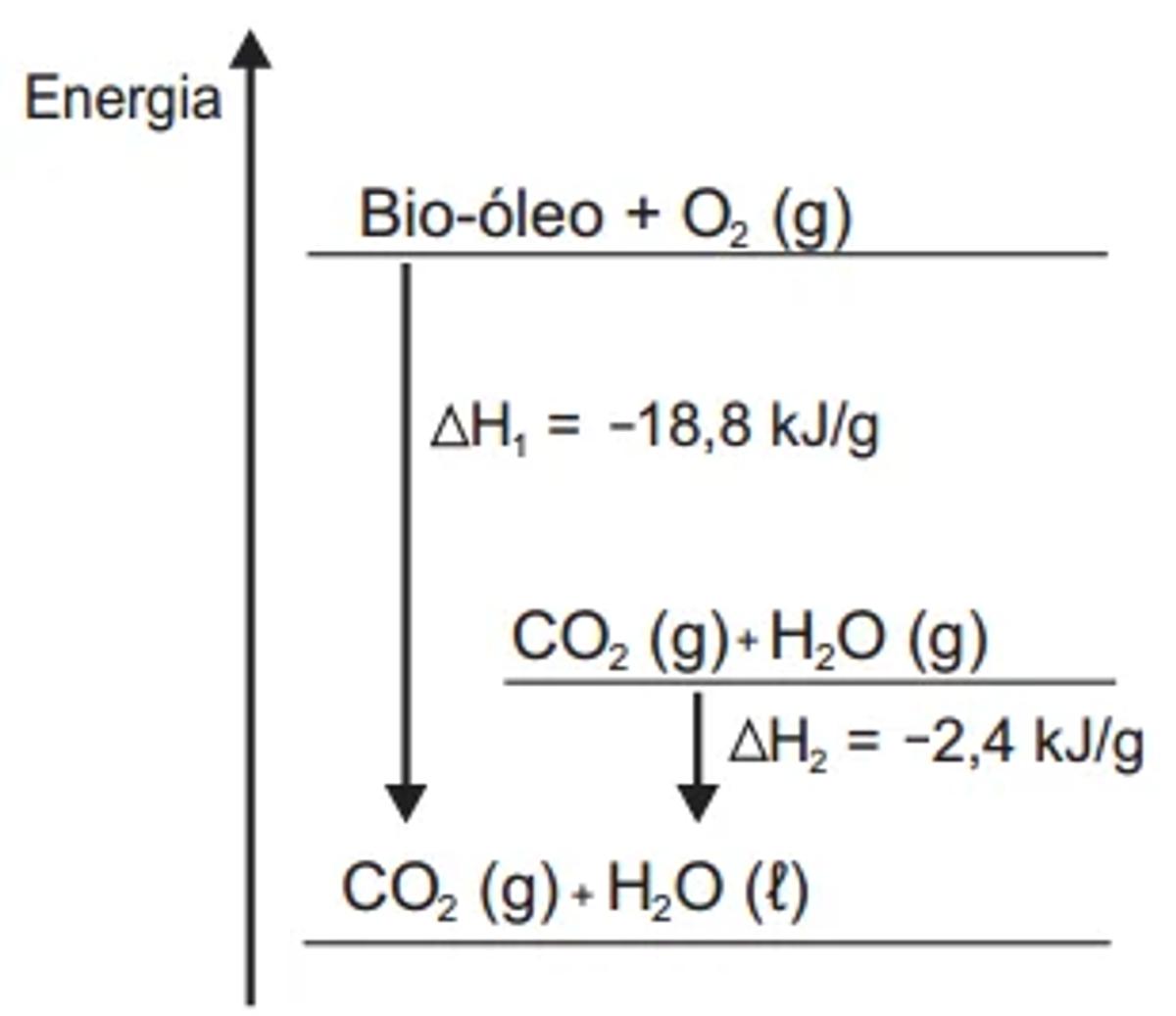 O aproveitamento de resíduos florestais vem se tornando cada dia mais atrativo, pois eles são uma fonte renovável de energia. A figura representa a queima de um bio-óleo extraído do resíduo de madeira, sendo ΔH1 a variação de entalpia devido à queima de 1g desse bio-óleo, resultando em gás carbônico e água líquida, e ΔH2 a variação de entalpia envolvida na conversão de 1g de água no estado gasoso para o estado líquido.