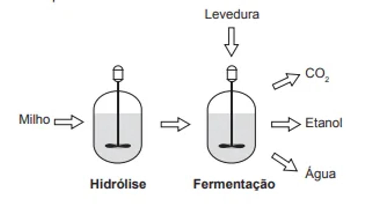 O esquema representa, de maneira simplificada, o processo de produção de etanol utilizando milho como