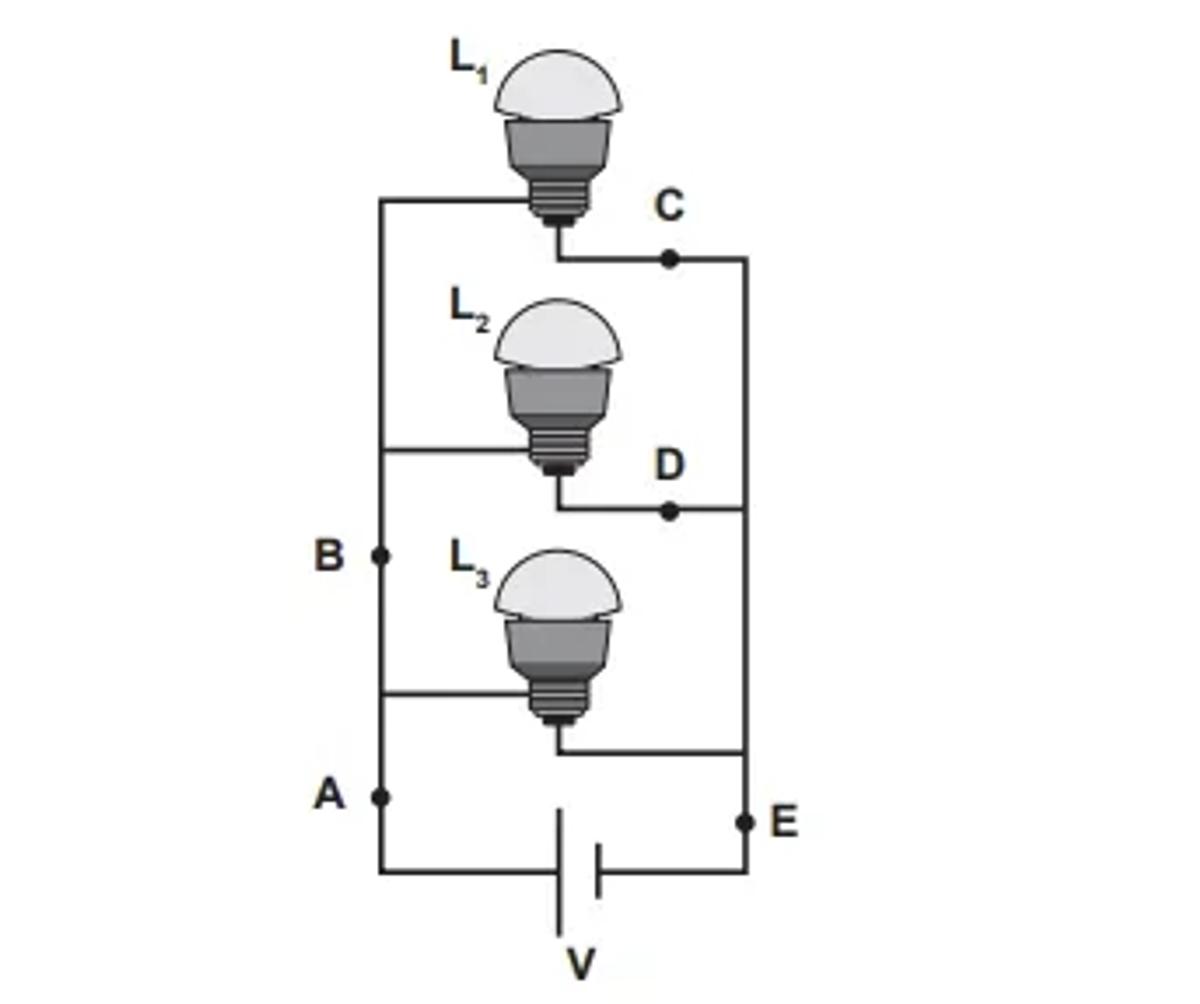 Três lâmpadas idênticas foram ligadas no circuito esquematizado. A bateria apresenta resistência interna desprezível, e os fios possuem resistência nula. Um técnico fez uma análise do circuito para prever a corrente elétrica nos pontos: A, B, C, D e E; e rotulou essas correntes de IA,IB,IC,ID e IE, respectivamente.