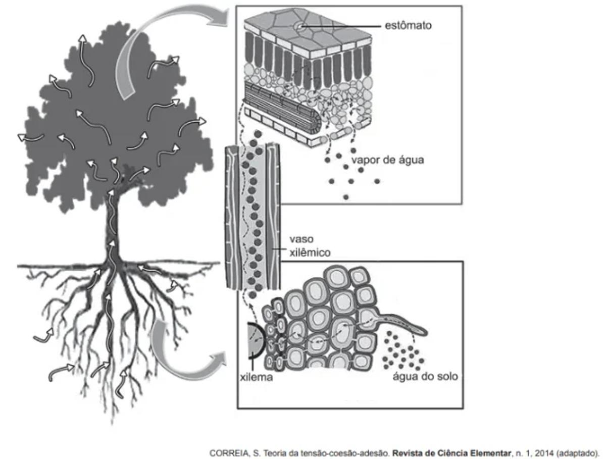 A figura ilustra o movimento da seiva xilêmica em uma planta.
