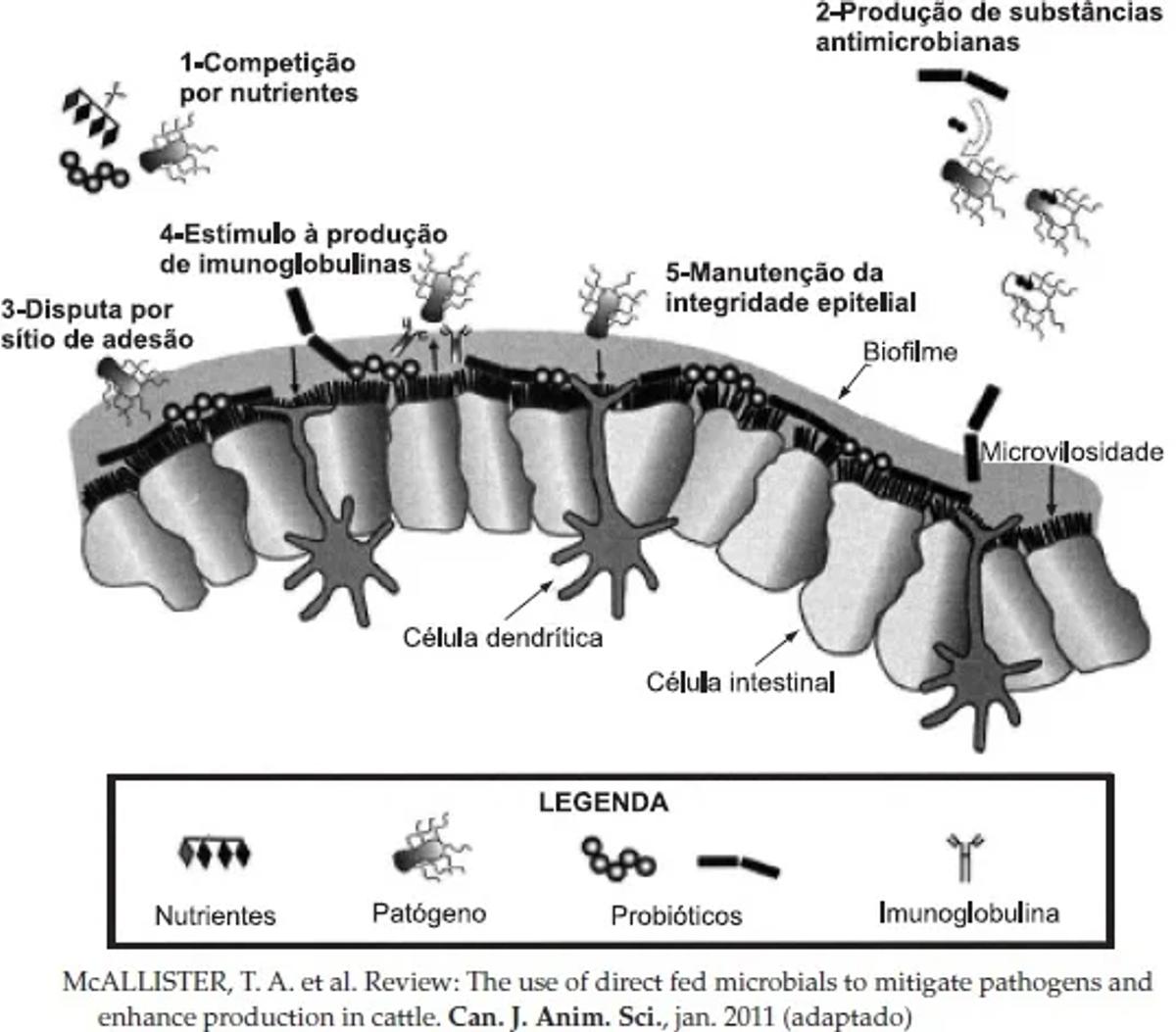 Vários métodos são empregados para prevenção de infecções por microrganismos. Dois desses métodos utilizam microrganismos vivos e são eles: as vacinas atenuadas, constituídas por patógenos avirulentos, e os probióticos que contêm bactérias benéficas. Na figura são apresentados cinco diferentes mecanismos de exclusão de patógenos pela ação dos probióticos no intestino de um animal.