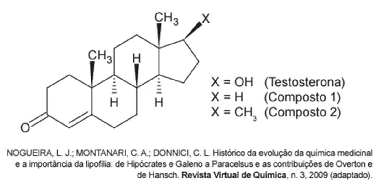 Em relação ao coeficiente de partição da testosterona, as lipofilias dos compostos 1 e 2 são, respectivamente,