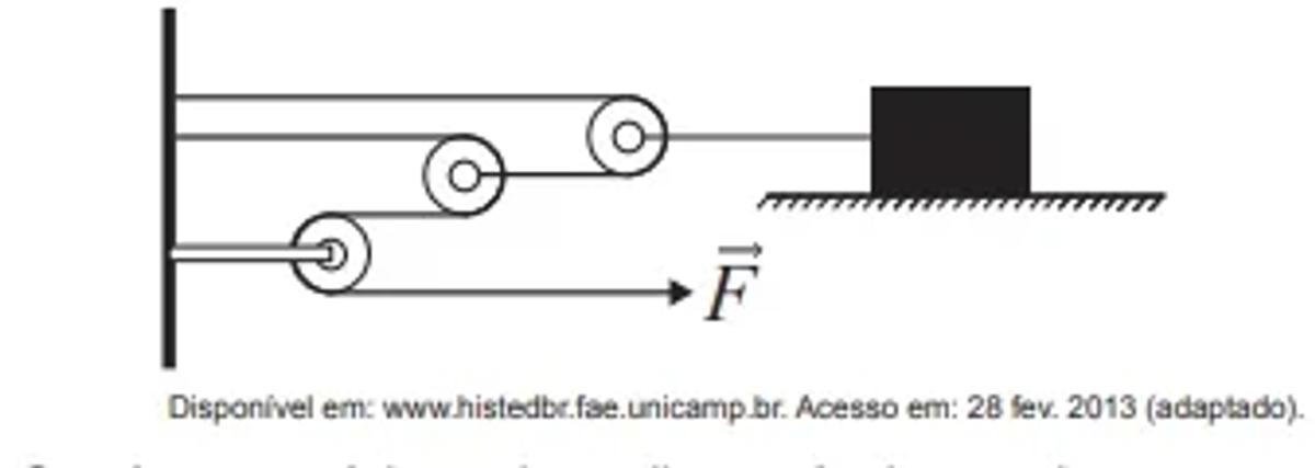 Uma invenção que significou um grande avanço tecnológico na Antiguidade, a polia composta ou a associação de polias, é atribuída a Arquimedes (287 a.C. a 212 a.C.). O aparato consiste em associar uma série de polias móveis a uma polia fixa. A figura exemplifica um arranjo possível para esse aparato. É relatado que Arquimedes teria demonstrado para o rei Hierão um outro arranjo desse aparato, movendo sozinho, sobre a areia da praia, um navio repleto de passageiros e cargas, algo que seria impossível sem a participação de muitos homens. Suponha que a massa do navio era de 3 000 kg, que o coeficiente de atrito estático entre o navio e a areia era de 0,8 e que Arquimedes tenha puxado o navio com uma força F → , paralela à direção do movimento e de módulo igual a 400 N. Considere os fios e as polias ideais, a aceleração da gravidade igual a 10 m/s2 e que a superfície da praia é perfeitamente horizontal.