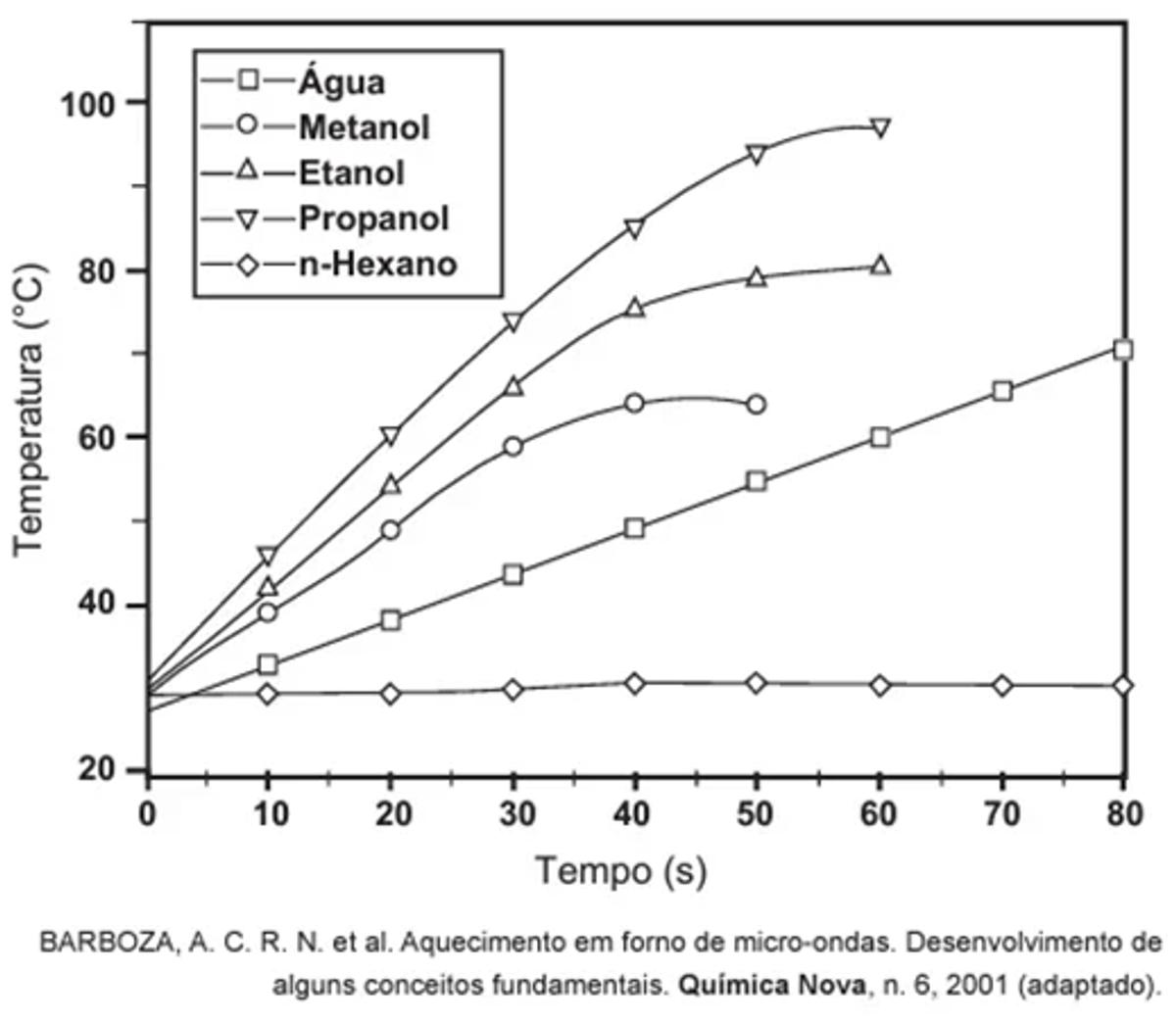 O aquecimento de um material por irradiação com micro-ondas ocorre por causa da interação da onda eletromagnética com o dipolo elétrico da molécula. Um importante atributo do aquecimento por micro-ondas é a absorção direta da energia pelo material a ser aquecido. Assim, esse aquecimento é seletivo e dependerá, principalmente, da constante dielétrica e da frequência de relaxação do material. O gráfico mostra a taxa de aquecimento de cinco solventes sob irradiação de micro-ondas.