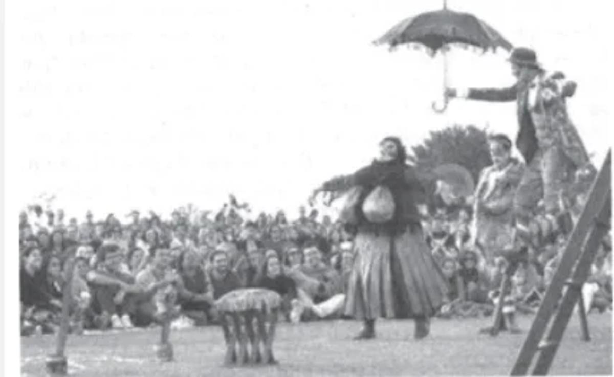 A principal razão pela qual se infere que o espetáculo retratado na fotografia é uma manifestação do teatro de rua é o fato de