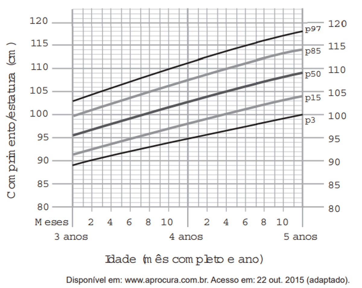 Uma menina aos 3 anos de idade tinha altura de 85 centímetros e aos 4 anos e 4 meses sua altura chegou a um valor que corresponde a um ponto exatamente sobre a curva p50.