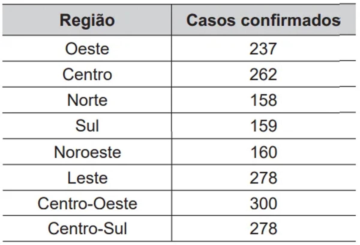 Em uma cidade, o número de casos de dengue confirmados aumentou consideravelmente nos últimos dias. A prefeitura resolveu desenvolver uma ação contratando funcionários para ajudar no combate à doença, os quais orientarão os moradores a eliminarem criadouros do mosquito Aedes aegypti, transmissor da dengue. A tabela apresenta o número atual de casos confirmados, por região da cidade.