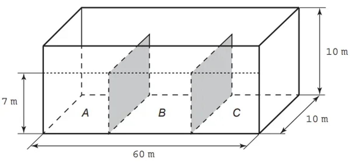 Um petroleiro possui reservatório em formato de um paralelepípedo retangular com as dimensões dadas por 60 m × 10 m de base e 10 m de altura. Com o objetivo de minimizar o impacto ambiental de um eventual vazamento, esse reservatório é subdividido em três compartimentos, A, B e C, de mesmo volume, por duas placas de aço retangulares com dimensões de 7 m de altura e 10 m de base, de modo que os compartimentos são interligados, conforme a figura. Assim, caso haja rompimento no casco do reservatório, apenas uma parte de sua carga vazará.