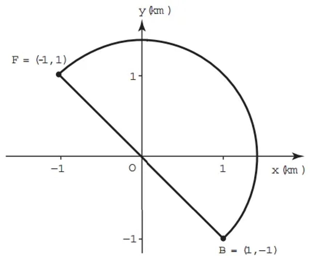 Após avaliações, foram apresentados dois projetos para o trajeto de construção da galeria: um segmento de reta que atravessaria outros bairros ou uma semicircunferência que contornaria esses bairros, conforme ilustrado no sistema de coordenadas x e y da figura, em que a unidade de medida nos eixos é o quilômetro.