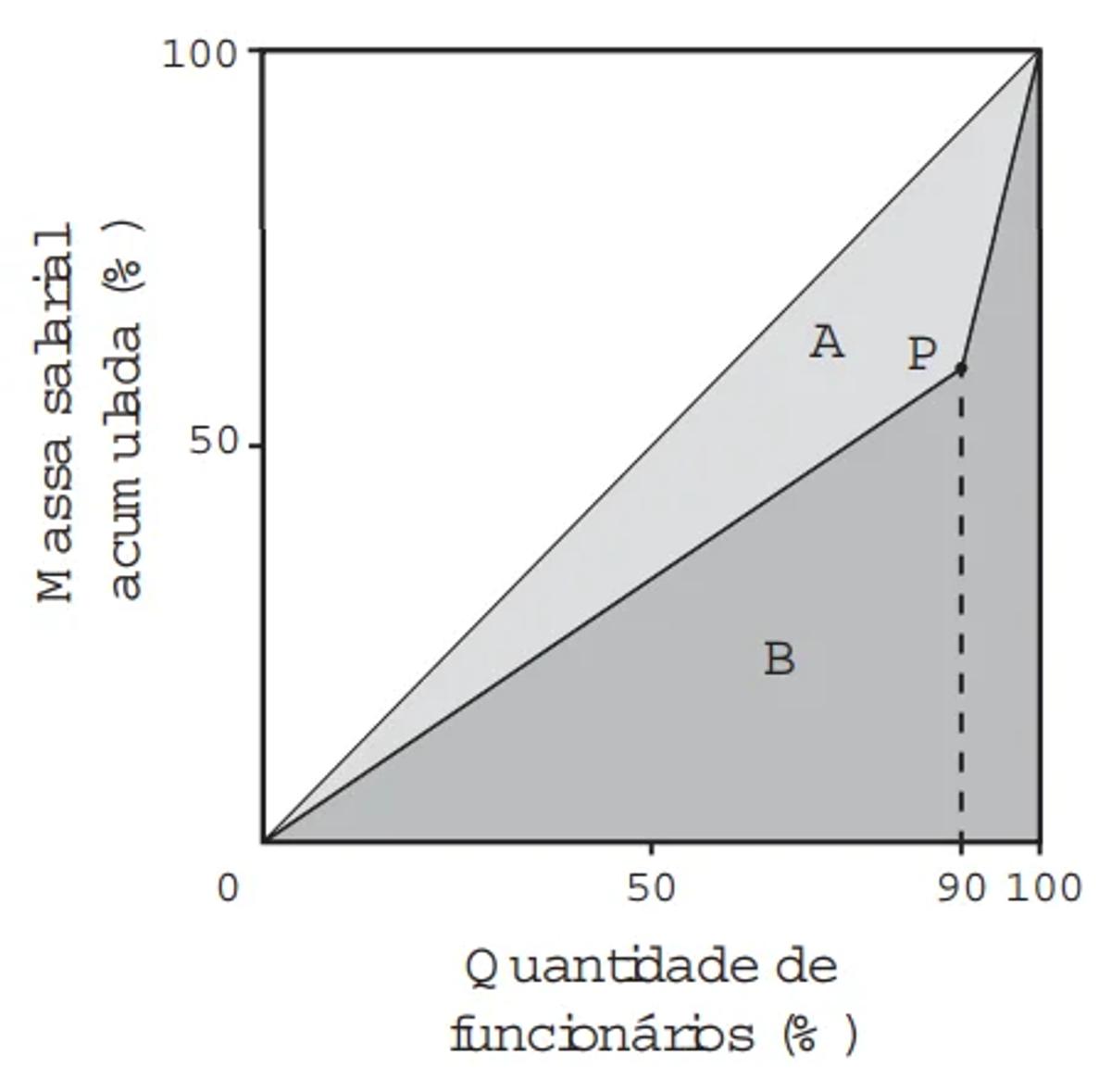 No eixo horizontal do gráfico tem-se o percentual de funcionários, ordenados de forma crescente pelos valores de seus salários, e no eixo vertical tem-se o percentual do total da massa salarial de todos os funcionários.