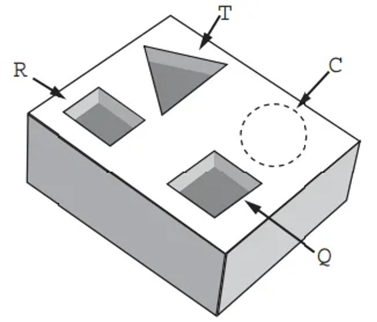 Um marceneiro está construindo um material didático que corresponde ao encaixe de peças de madeira com 10 cm de altura e formas geométricas variadas, num bloco de madeira em que cada peça se posicione na perfuração com seu formato correspondente, conforme ilustra a figura. O bloco de madeira já possui três perfurações prontas de bases distintas: uma quadrada (Q), de lado 4 cm, uma retangular (R), com base 3 cm e altura 4 cm, e uma em forma de um triângulo equilátero (T), de lado 6,8 cm. Falta realizar uma perfura-ção de base circular (C).