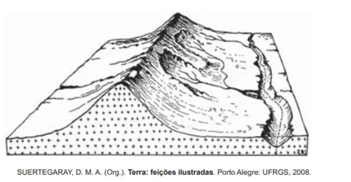 As características morfológicas do terreno estão representadas no bloco diagrama, que mostra uma região acometida por processos erosivos decorrentes da
