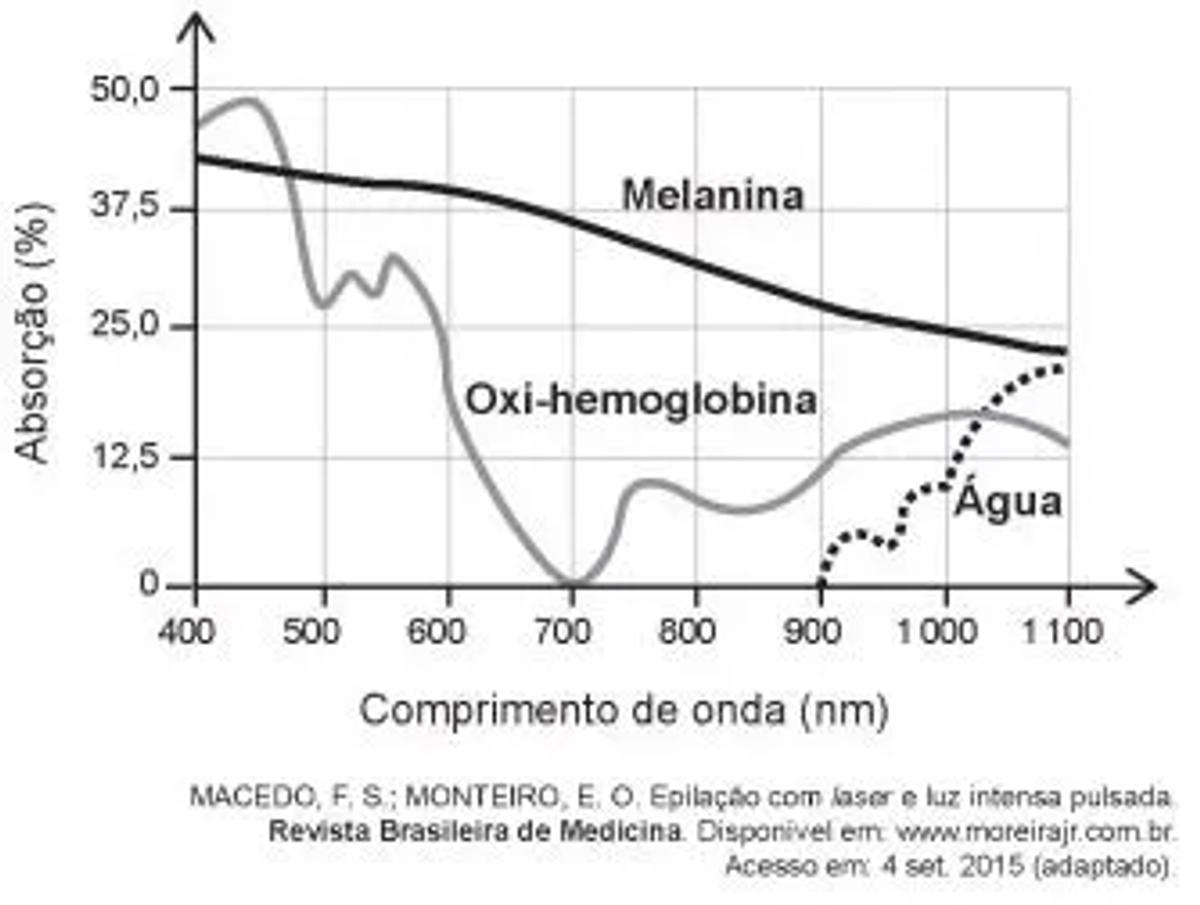 A epilação a laser (popularmente conhecida como depilação a laser) consiste na aplicação de uma fonte de luz para aquecer e causar uma lesão localizada e controlada nos folículos capilares. Para evitar que outros tecidos sejam danificados, selecionam-se comprimentos de onda que são absorvidos pela melanina presente nos pelos, mas que não afetam a oxi-hemoglobina do sangue e a água dos tecidos da região em que o tratamento será aplicado. A figura mostra como é a absorção de diferentes comprimentos de onda pela melanina, oxi-hemoglobina e água.