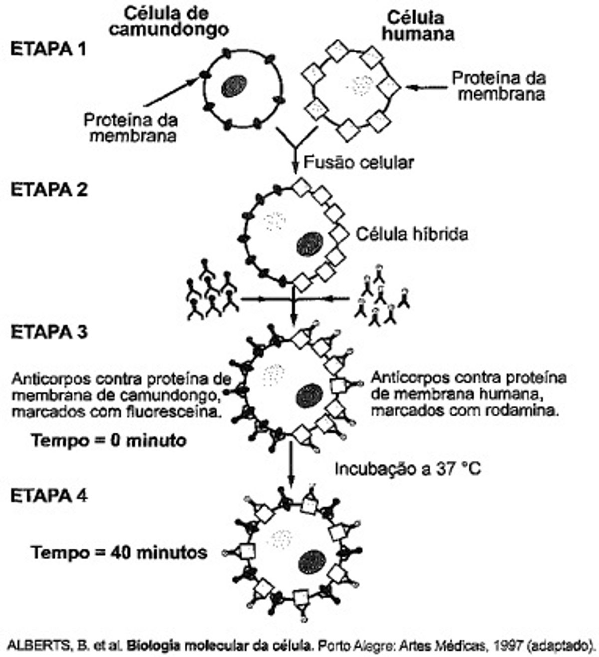 Visando explicar uma das propriedades da membrana plasmática, fusionou-se uma célula de camundongo com uma célula humana, formando uma célula híbrida. Em seguida, com o intuito de marcar as proteínas de membrana, dois anticorpos foram inseridos no experimento, um específico para as proteínas de membrana do camundongo e outro para as proteínas de membrana humana. Os anticorpos foram visualizados ao microscópio por meio de fluorescência de cores diferentes.