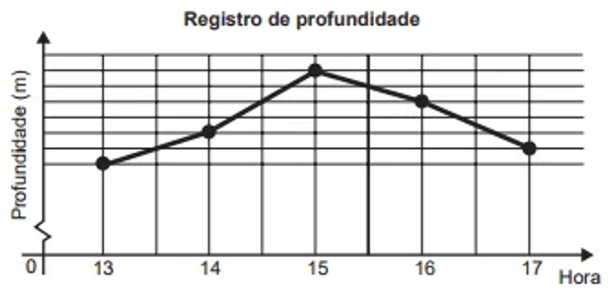Num dia de tempestade, a alteração na profundidade de um rio, num determinado local, foi registrada durante um período de 4 horas. Os resultados estão indicados no gráfico de linhas. Nele, a profundidade h, registrada às 13 horas, não foi anotada e, a partir de h, cada unidade sobre o eixo vertical representa um metro.