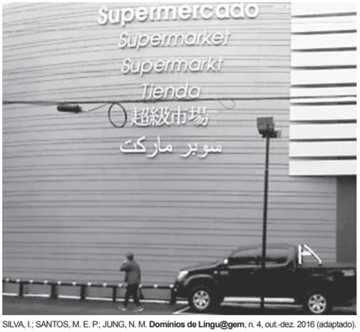 A fotografia exibe a fachada do um supermercado em Foz do Iguaçu, cuja localização transfronteiriça é marcada tanto pelo limite com Argentina o Paraguai quanto pela presença de outros povos. Essa fachada revela o(a)