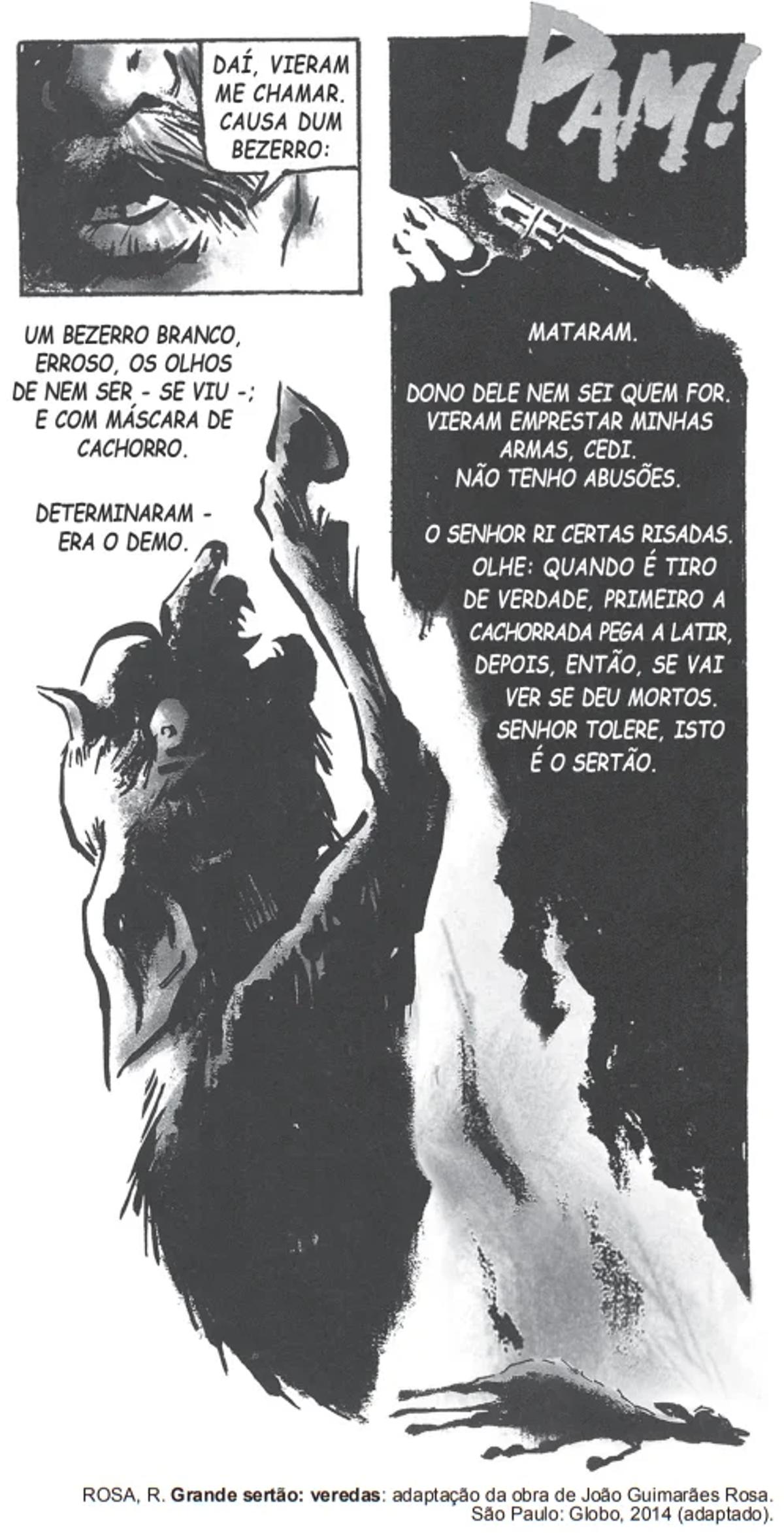 A imagem integra uma adaptação em quadrinhos da obra Grande sertão: veredas, de Guimarães Rosa. Na representação gráfica, a inter-relação de diferentes linguagens caracteriza-se por