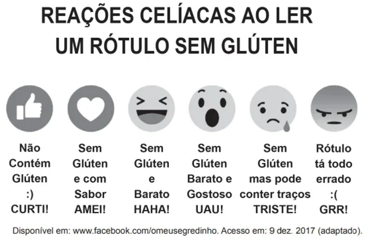 Essa imagem ilustra a reação dos celíacos (pessoas sensíveis ao glúten) ao ler rótulos de alimentos sem glúten. Essas reações indicam que, em geral, os rótulos desses produtos
