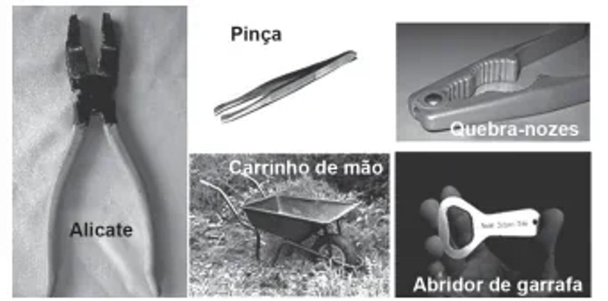 As pessoas que utilizam objetos cujo princípio de funcionamento é o mesmo do das alavancas aplicam uma força, chamada de força potente, em um dado ponto da barra, para superar ou equilibrar uma segunda força, chamada de resistente, em outro ponto da barra. Por causa das diferentes distâncias entre os pontos de aplicação das forças, potente e resistente, os seus efeitos também são diferentes. A figura mostra alguns exemplos desses objetos.
