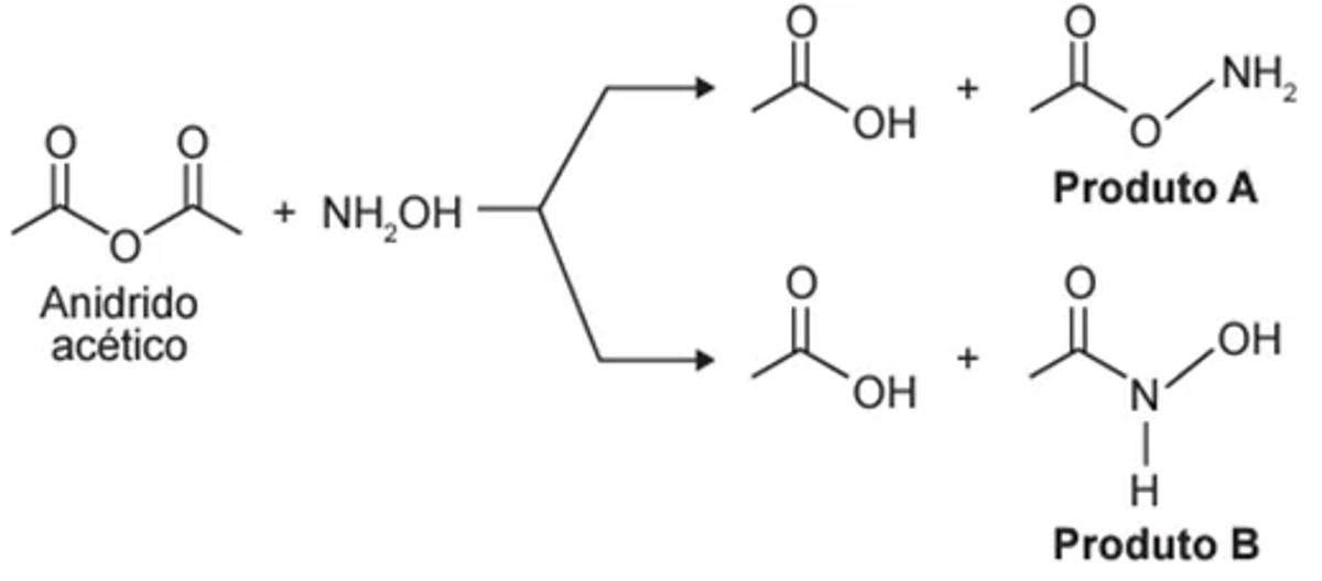 A hidroxilamina (NH2OH) é extremamente reativa em reações de substituição nucleofílica, justificando sua utilização em diversos processos. A reação de substituição nucleofílica entre o anidrido acético e a hidroxilamina está representada.