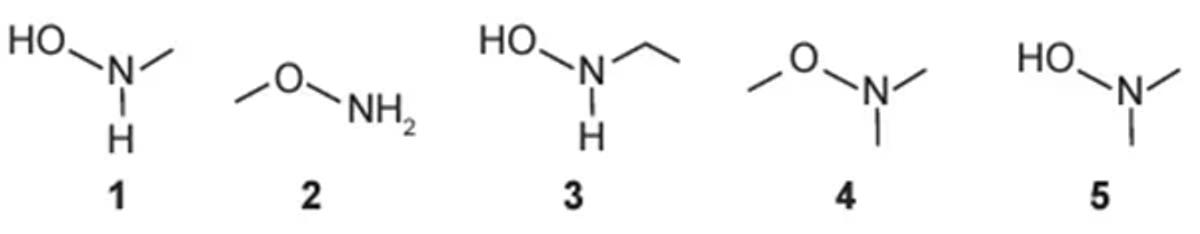 O produto A é favorecido em relação ao B, por um fator de 105. Em um estudo de possível substituição do uso de hidroxilamina, foram testadas as moléculas numeradas de 1 a 5.