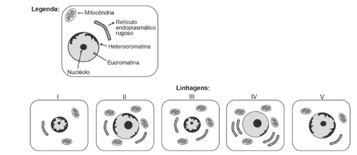 O nível metabólico de uma célula pode ser determinado pela taxa de síntese de RNAs e proteínas, processos dependentes de energia. Essa diferença na taxa de síntese de biomoléculas é refletida na abundância e características morfológicas dos componentes celulares. Em uma empresa de produção de hormônios proteicos a partir do cultivo de células animais, um pesquisador deseja selecionar uma linhagem com o metabolismo de síntese mais elevado, dentre as cinco esquematizadas na figura.