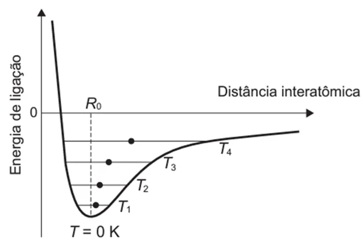Alguns materiais sólidos são compostos por átomos que interagem entre si formando ligações que podem ser covalentes, iônicas ou metálicas. A figura apresenta a energia potencial de ligação em função da distância interatômica em um sólido cristalino. Analisando essa figura, observa-se que, na temperatura de zero kelvin, a distância de equilíbrio da ligação entre os átomos (R0) corresponde ao valor mínimo de energia potencial. Acima dessa temperatura, a energia térmica fornecida aos átomos aumenta sua energia cinética e faz com que eles oscilem em torno de uma posição de equilíbrio média (círculos cheios), que é diferente para cada temperatura. A distância de ligação pode variar sobre toda a extensão das linhas horizontais, identificadas com o valor da temperatura, de T1 a T4 (temperaturas crescentes).