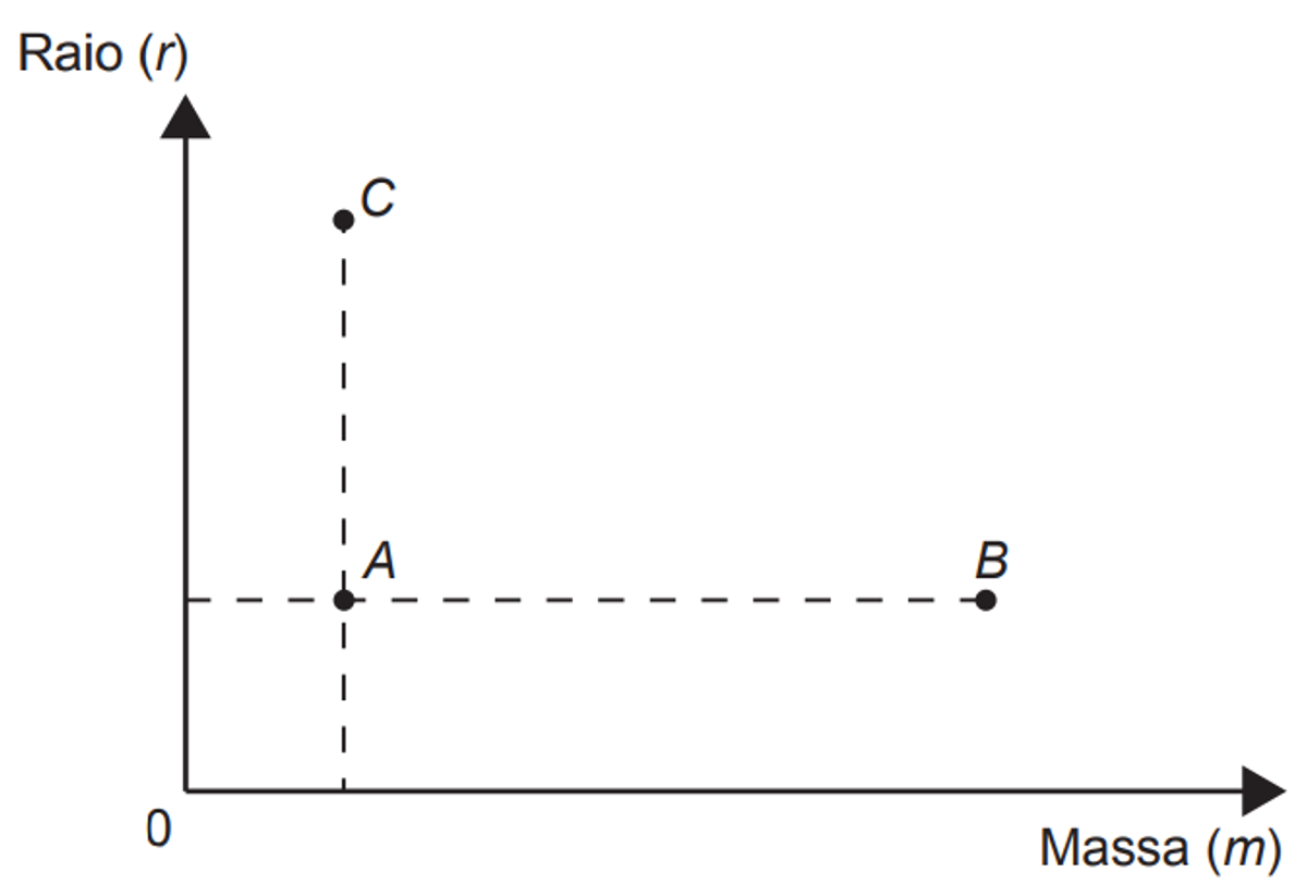 No plano cartesiano, três satélites, A, B e C, estão representados, cada um, por um ponto (m ; r) cujas coordenadas são, respectivamente, a massa do satélite e o raio da sua órbita em torno da Terra.