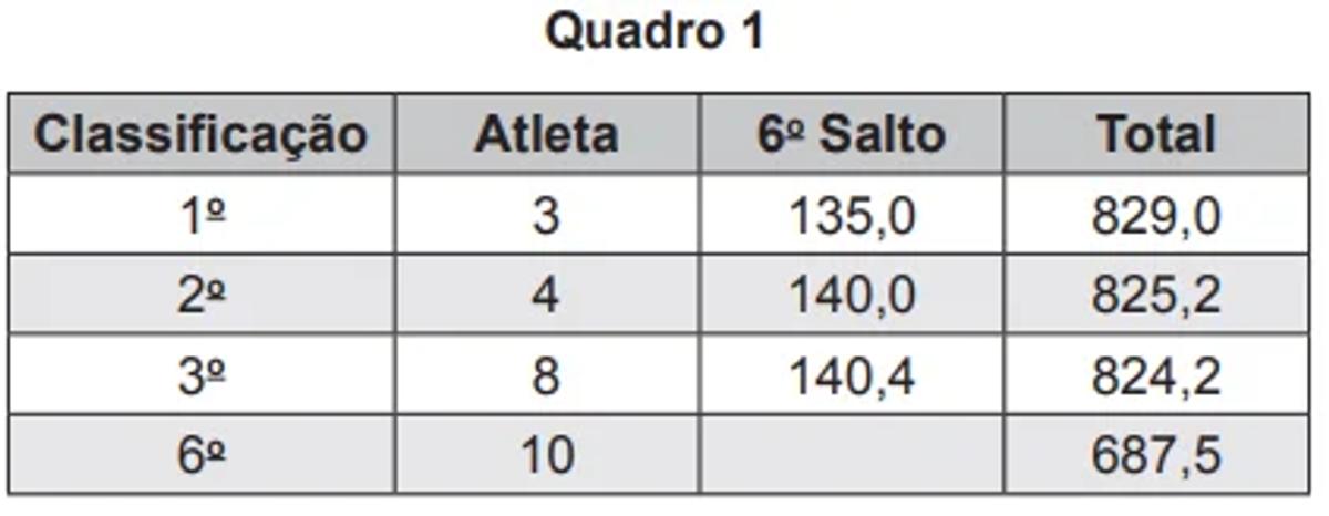 Fica em primeiro lugar o atleta que obtiver a maior soma das seis notas recebidas. O atleta 10 irá realizar o último salto da final. Ele observa no Quadro 1, antes de executar o salto, o recorte do quadro parcial de notas com a sua classificação e a dos três primeiros lugares até aquele