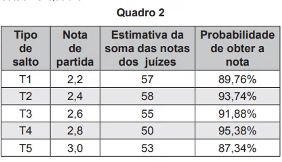 Ele precisa decidir com seu treinador qual salto deverá realizar. Os dados dos possíveis tipos de salto