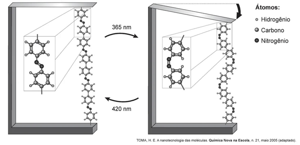 Pesquisas demonstram que nanodispositivos baseados em movimentos de dimensões atômicas, induzidos por luz, poderão ter aplicações em tecnologias futuras, substituindo micromotores, sem a necessidade de componentes mecânicos. Exemplo de movimento molecular induzido pela luz pode ser observado pela flexão de uma lâmina delgada de silício, ligado a um polímero de azobenzeno e a um material suporte, em dois comprimentos de onda, conforme ilustrado na figura. Com a aplicação de luz ocorrem reações reversíveis da cadeia do polímero, que promovem o movimento observado.