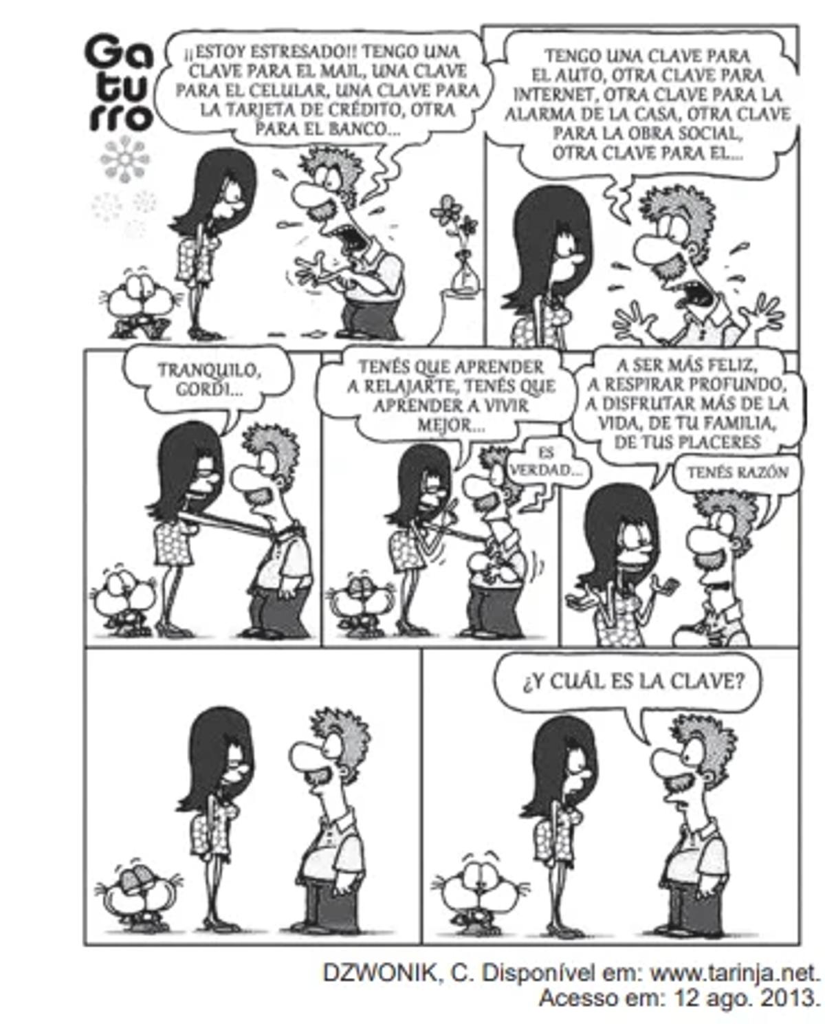 A palavra clave, repetida diversas vezes na tirinha de Gaturro, leva o leitor a uma reflexão sobre o(a)