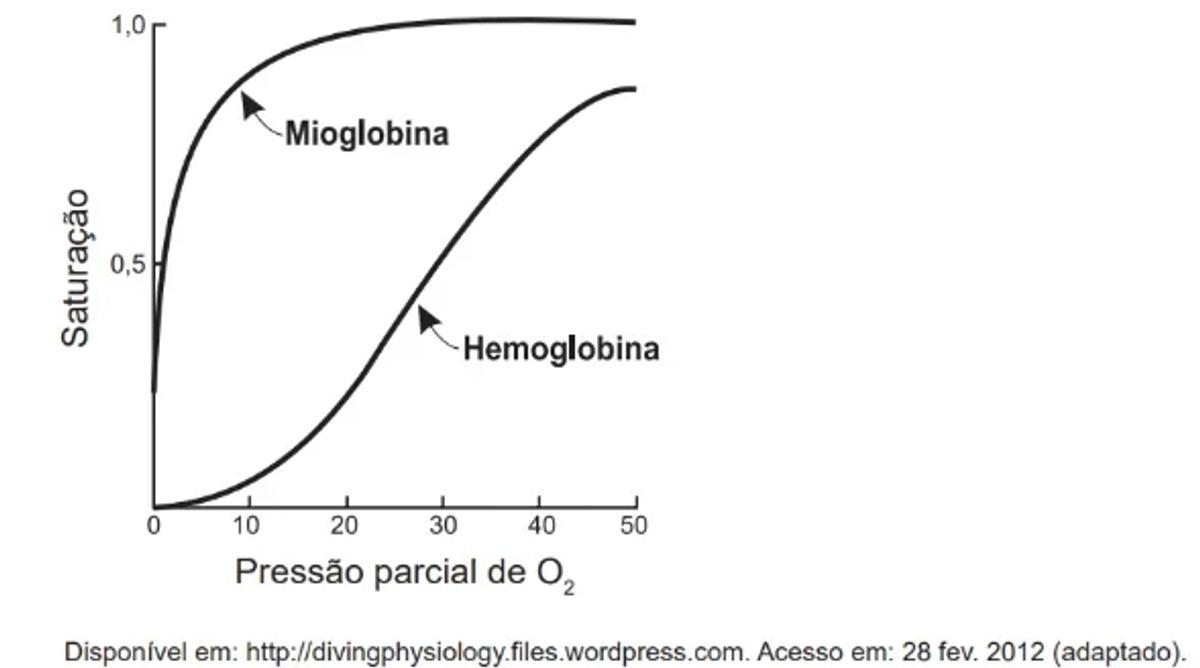 A figura mostra a curva de saturação da hemoglobina e da mioglobina em função da pressão parcial de oxigênio e reflete a afinidade de cada proteína pelo oxigênio. Embora ambas sejam hemoproteínas ligantes de oxigênio, a hemoglobina transporta oxigênio dos pulmões para os tecidos pela corrente sanguínea, e a mioglobina se liga ao oxigênio dentro das células musculares.