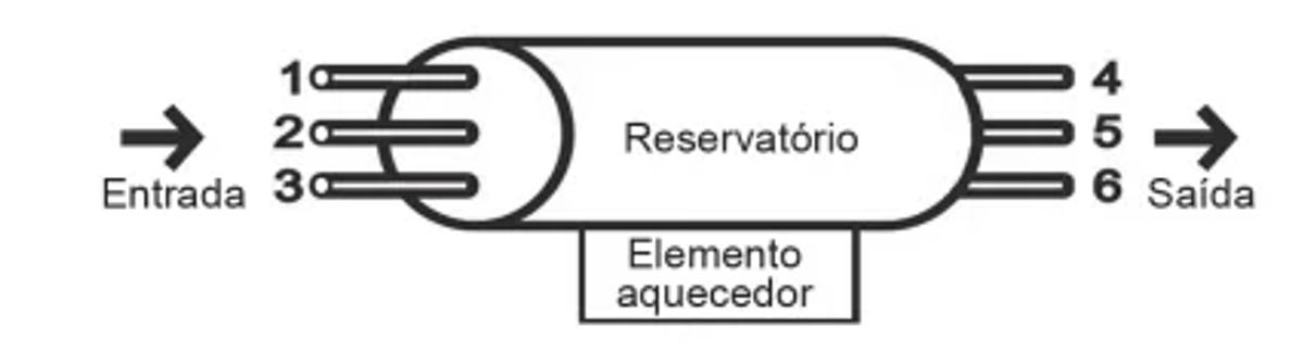 Em uma residência com aquecimento central, um reservatório é alimentado com água fria, que é aquecida na base do reservatório e, a seguir, distribuída para as torneiras. De modo a obter a melhor eficiência de aquecimento com menor consumo energético, foram feitos alguns testes com diferentes configurações, modificando-se as posições de entrada de água fria e de saída de água quente no reservatório, conforme a figura. Em todos os testes, as vazões de entrada e saída foram mantidas iguais e constantes.