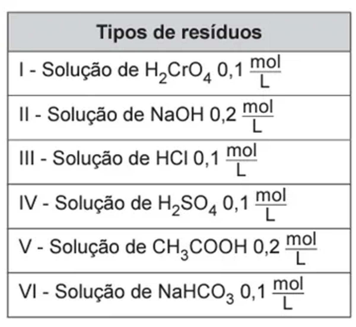 Laboratórios de química geram como subprodutos substâncias ou misturas que, quando não têm mais utilidade nesses locais, são consideradas resíduos químicos. Para o descarte na rede de esgoto, o resíduo deve ser neutro, livre de solventes inflamáveis e elementos tóxicos como Pb, Cr e Hg. Uma possibilidade é fazer uma mistura de dois resíduos para obter um material que apresente as características necessárias para o descarte. Considere que um laboratório disponha de frascos de volumes iguais cheios dos resíduos, listados no quadro.