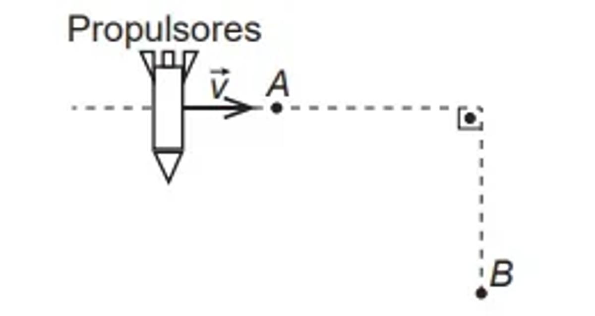 Um foguete viaja pelo espaço sideral com os propulsores desligados. A velocidade inicial v tem módulo constante e direção perpendicular à ação dos propulsores, conforme indicado na figura. O piloto aciona os propulsores para alterar a direção do movimento quando o foguete passa pelo ponto A e os desliga quando o módulo de sua velocidade final é superior a 2 | v |, o que ocorre antes de passar pelo ponto B. Considere as interações desprezíveis.