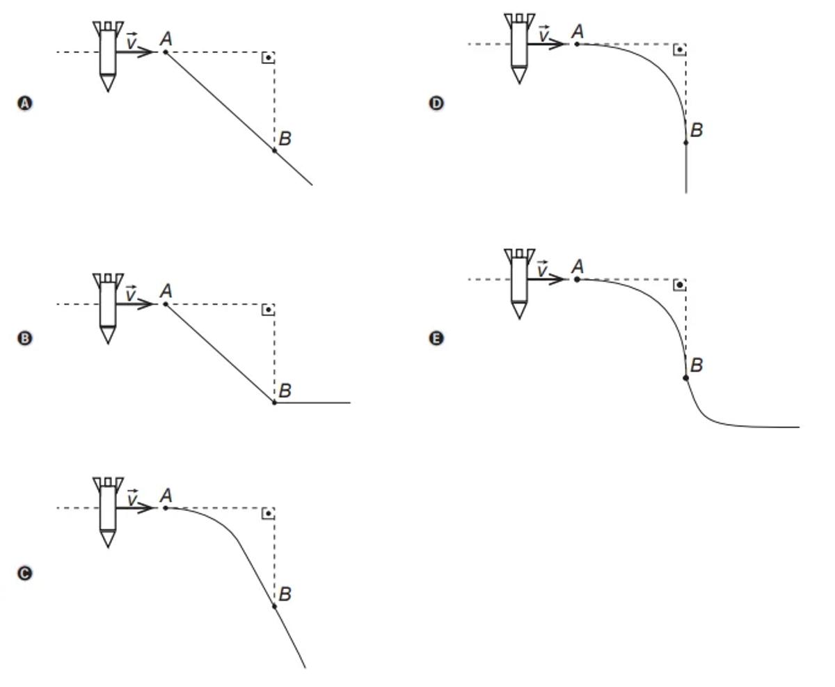A representação gráfica da trajetória seguida pelo foguete, antes e depois de passar pelo ponto B, é: