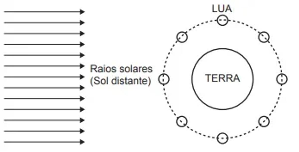 A figura mostra, de forma esquemática, uma representação comum em diversos livros e textos sobre eclipses. Apenas analisando essa figura, um estudante pode concluir que os eclipses podem ocorrer duas vezes a cada volta completa da Lua em torno da Terra. Apesar de a figura levar a essa percepção, algumas informações adicionais são necessárias para se concluir que nem o eclipse solar, nem o lunar ocorrem com tal periodicidade.
