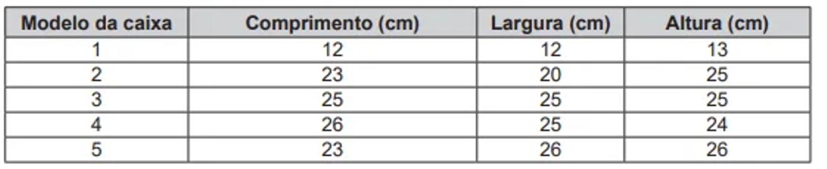 Uma empresa de transporte disponibiliza, para embalagem de encomendas, caixas de papelão no formato de paralelepípedo retoretângulo, conforme dimensões no quadro.