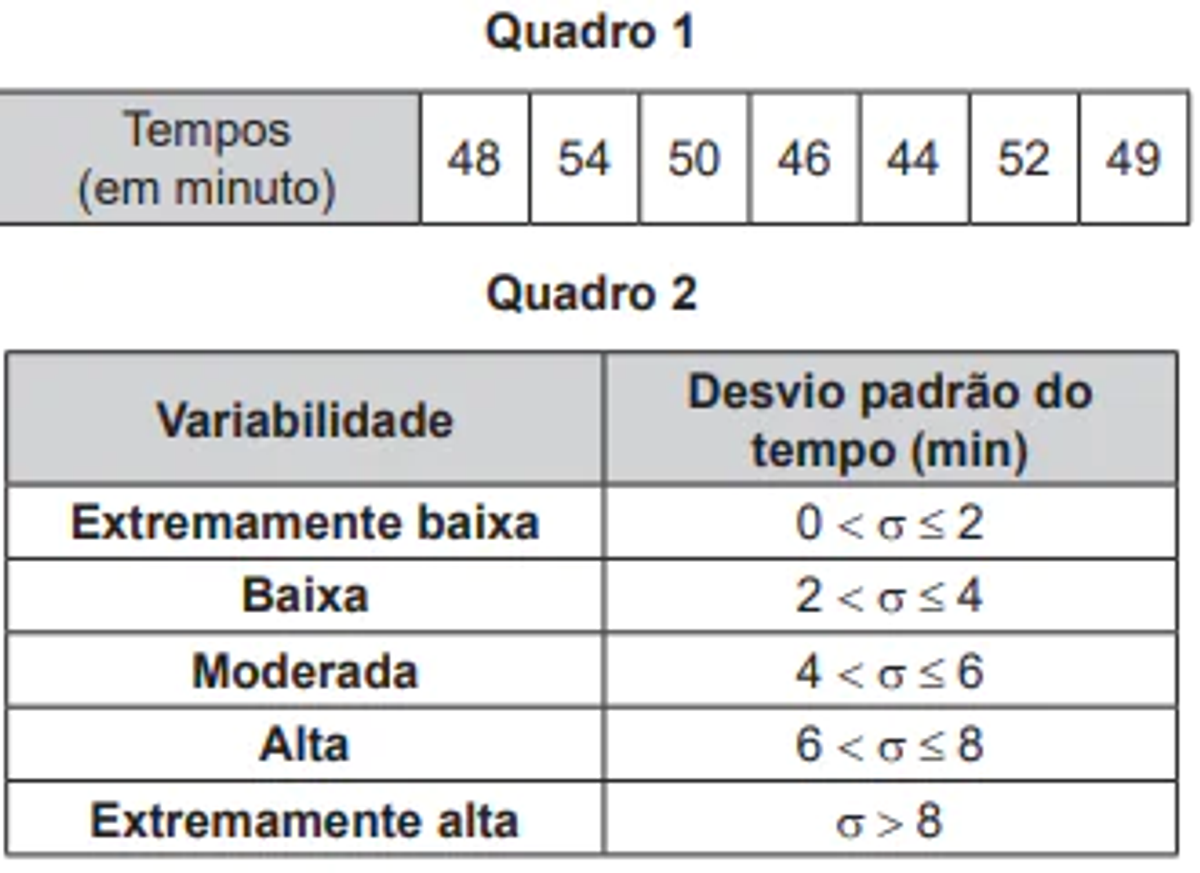 Um fiscal de certa empresa de ônibus registra o tempo, em minuto, que um motorista novato gasta para completar certo percurso. No Quadro 1 figuram os tempos gastos pelo motorista ao realizar o mesmo percurso sete vezes. O Quadro 2 apresenta uma classificação para a variabilidade do tempo, segundo o valor do desvio padrão