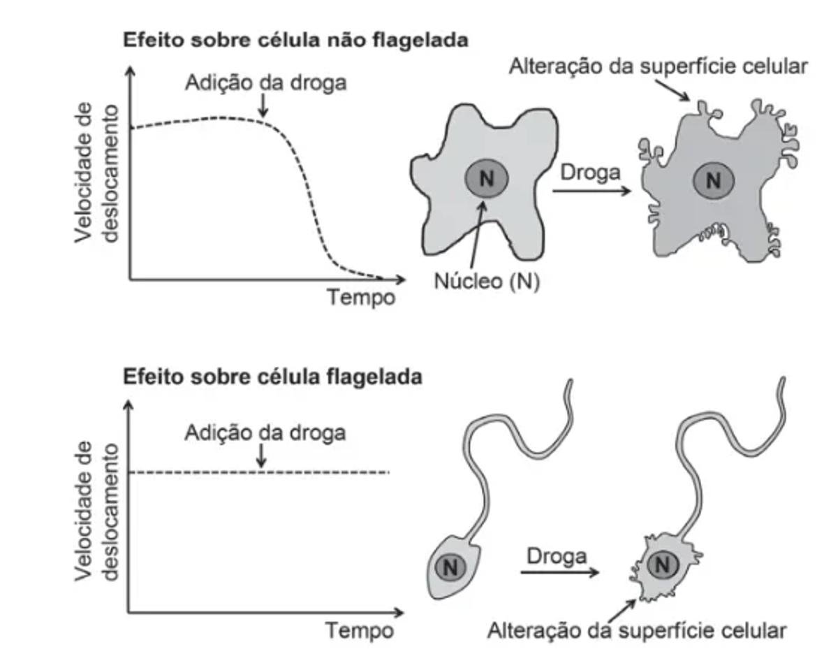 A ação de uma nova droga antitumoral sobre o citoesqueleto foi investigada. O pesquisador comparou o efeito da droga na velocidade de deslocamento celular e na integridade de filamentos do córtex celular e de flagelos, conforme apresentado na figura.