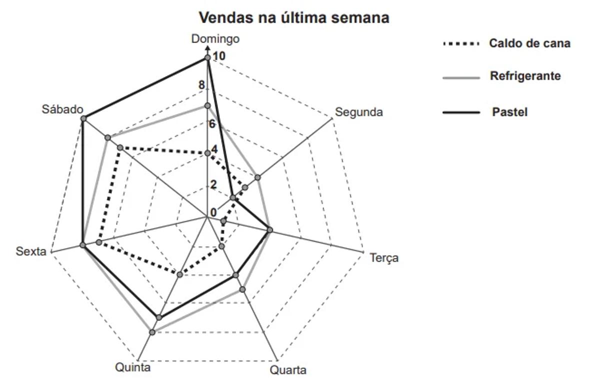 Um comerciante, que vende somente pastel, refrigerante em lata e caldo de cana em copos, fez um levantamento das vendas realizadas durante a semana. O resultado desse levantamento está apresentado no gráfico.