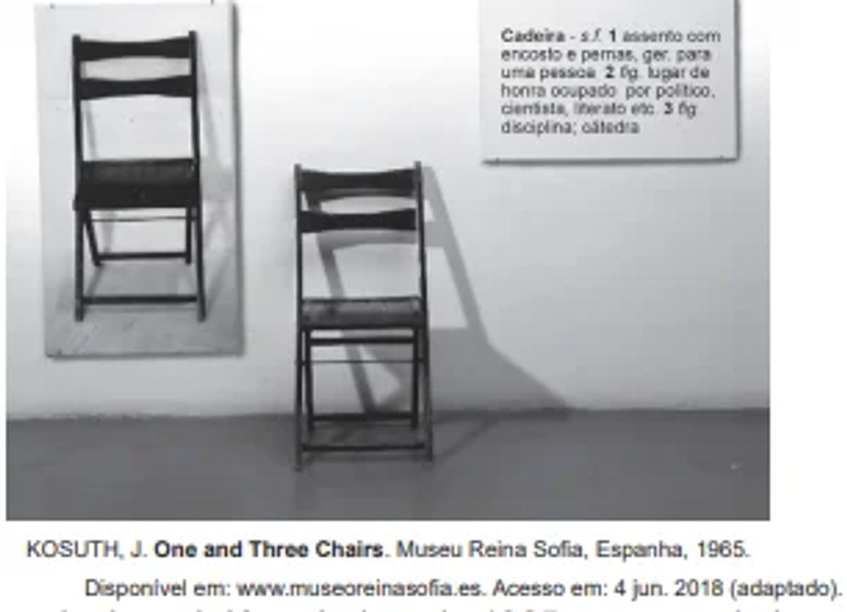 A obra de Joseph Kosuth data de 1965 e se constitui por uma fotografia de cadeira, uma cadeira exposta e um quadro com o verbete “Cadeira”. Trata-se de um exemplo de arte conceitual que revela o paradoxo entre verdade e imitação, já que a arte