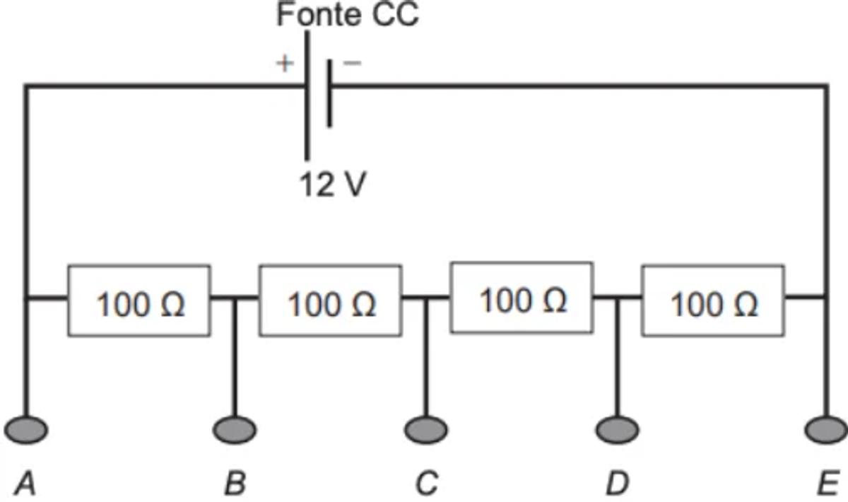 Entre quais pontos do divisor de tensão esse equipamento deve ser ligado para funcionar corretamente e qual será o valor da intensidade da corrente nele estabelecida?