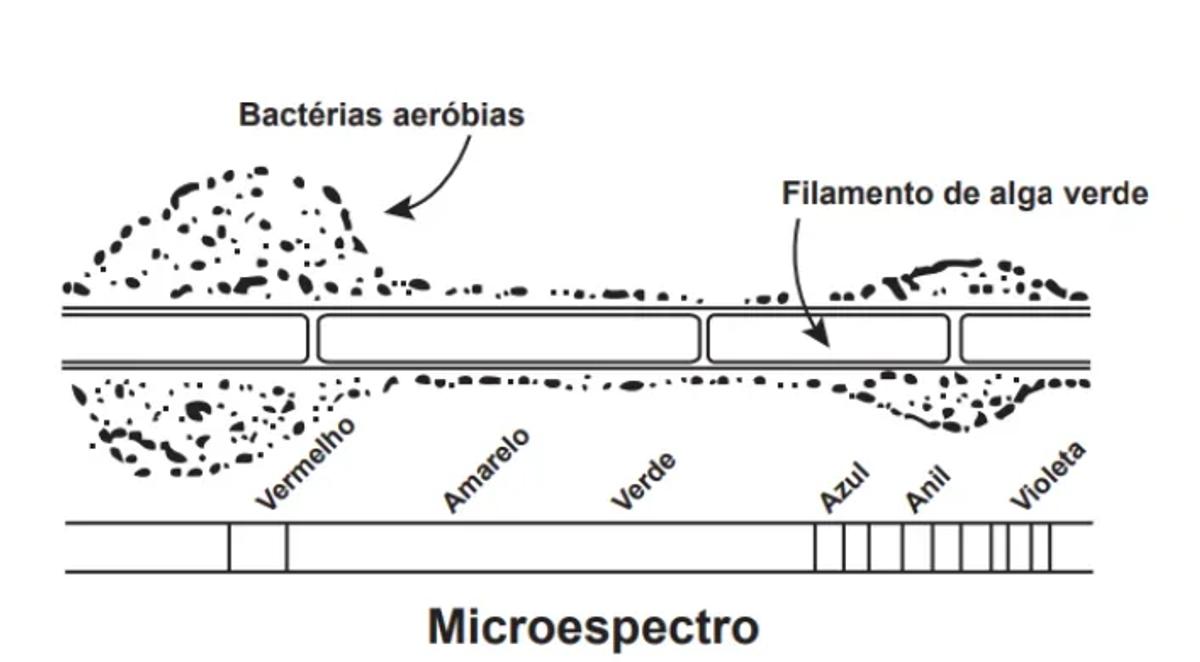 Em uma aula sobre metabolismo energético, foi apresentado um experimento clássico realizado por Engelmann. Um recipiente contendo bactérias aeróbias e uma alga verde filamentosa foi submetido à iluminação de uma fonte de luz, representada pelo microespectro. Após a explicação, um aluno esquematizou na lousa o resultado do referido experimento.