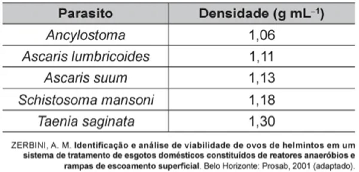 O exame parasitológico de fezes é utilizado para detectar ovos de parasitos. Um dos métodos utilizados, denominado de centrífugo-flutuação, considera a densidade dos ovos em relação a uma solução de densidade 1,15 g mL−1. Assim, ovos que flutuam na superfície dessa solução são detectados. Os dados de densidade dos ovos de alguns parasitos estão apresentados na tabela.