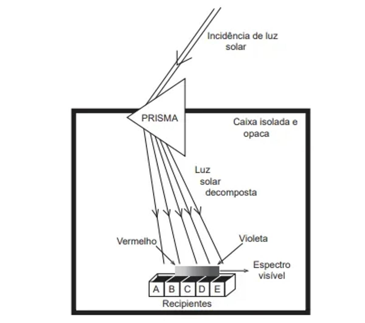 Para verificar a hipótese de Herschel, um estudante montou o dispositivo apresentado na figura. Nesse aparato, cinco recipientes contendo água, à mesma temperatura inicial, e separados por um material isolante térmico e refletor são posicionados lado a lado (A, B, C, D e E) no interior de uma caixa de material isolante térmico e opaco. A luz solar, ao entrar na caixa, atravessa o prisma e incide sobre os recipientes. O estudante aguarda até que ocorra o aumento da temperatura e a afere em cada recipiente.